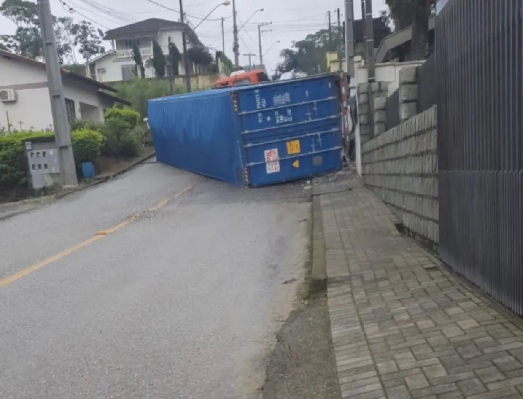 O contêiner de um caminhão Scania acabou tombando na rua Irmã Josefina, bairro Dom Joaquim, em Brusque. O acidente foi na manhã desta quarta-feira (13).