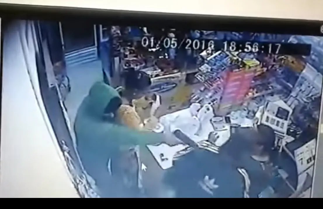No momento em que o bandido chega ao local havia três pessoas no caixa; a esposa do dono do estabelecimento, que trabalhava no caixa, além de outras duas pessoas, um homem e outra mulher.
