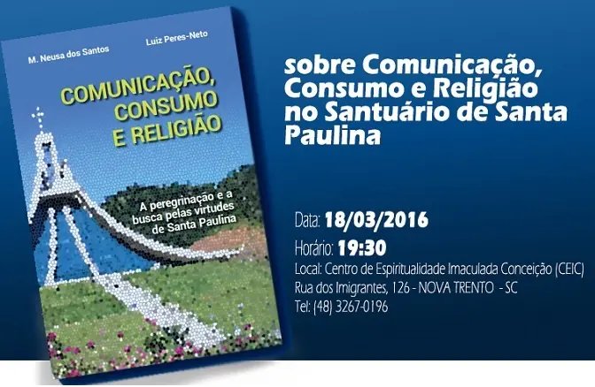 Acontece nesta sexta-feira (18) o lançamento do livro “Comunicação, consumo e religião – a peregrinação e a busca pelas virtudes de Santa Paulina”, da autora Irmã Neusa Santos. O evento está marcado para iniciar às 19h30min no Centro de Espiritualidade Imaculada Conceição (CEIC), em Nova Trento.
