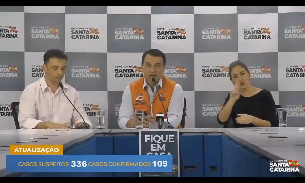 No final desta terça-feira (24) em entrevista coletiva o Governador Carlos Moisés da Silva atualizou os números sobre o Coronavírus. Conforme ele, Santa Catarina passa de 86 para 109 casos, de ontem para hoje houve um acréscimo de 23 casos.