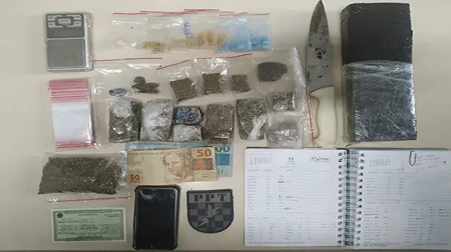 Durante as diligências logrou êxito em localizar aproximadamente 1kg de maconha, 15 gramas de haxixe, 8 gramas de MD, 10 comprimidos de ecstasy, e uma balança de precisão, mais um caderno de anotações sobre o tráfico, material para embalagem e 150 reais em dinheiro.