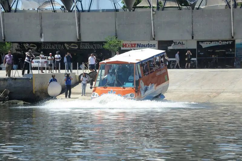 As árvores do Aterro do Flamengo e as águas da Baía de Guanabara podem ser vistas em um único passeio partir de hoje (1º), e só quem precisará trocar de assento é o motorista, que cede lugar ao marinheiro quando o ônibus anfíbio Duck Copacabana desce a rampa da Marina da Glória e entra no mar. Projeto de empresários brasileiros, o veículo é o primeiro do Brasil a percorrer água e asfalto em um trajeto turístico.