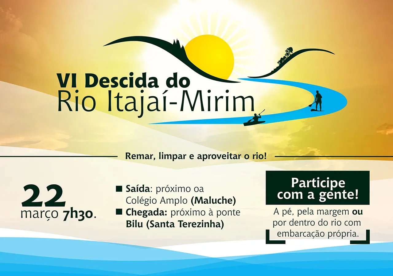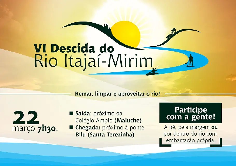 Encerram quinta-feira (15) encerra o período de inscrições para a sexta edição da Descida do Rio Itajaí-Mirim, que será realizada em 22 de março, Dia da Água. Para se inscrever basta acessar o link https://goo.gl/o7gXvd. É possível participar com embarcação própria ou a pé pelas margens. As vagas são limitadas.