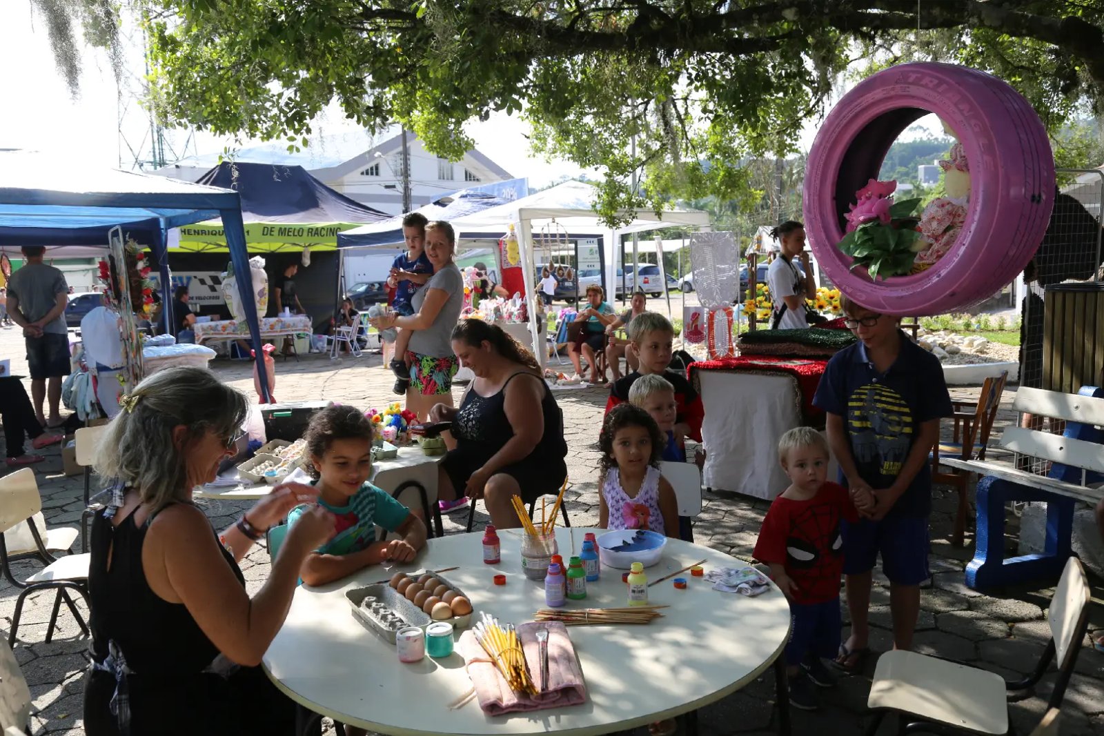 O primeiro dia de Páscoa Encantada realizado no sábado, 10 de março, atraiu inúmeras famílias para a Praça Theodoro Debatin, Centro de Guabiruba. O público pode participar do aulão de zumba em frente à Prefeitura Municipal, degustar produtos locais e apreciar o artesanato da Feira, além de aproveitar os brinquedos infláveis destinado às crianças.