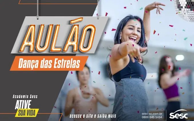 No próximo sábado (07), Sesc abrirá o projeto “Aulão Show – Dança das Estrelas” em sua rede de academias. Serão 29 cidades catarinenses beneficiadas com as aulas de ginástica temáticas, divertidas, dinâmicas e desafiadoras, conduzidas por instrutores prontos para orientação, liderança e incentivo da movimentação dos participantes. A atividade é gratuita, aberta aos alunos e ao público em geral, e acontecerá a cada três meses, aos sábados, nas Unidades da Instituição em todas as regiões do Estado.