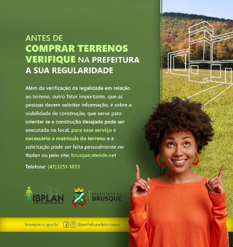 Para auxiliar as pessoas interessadas em comprar terrenos em Brusque, a prefeitura municipal está lançando a ação: “Antes de Comprar Verifique”. O objetivo é que se verifique as condições legais do terreno antes da comprar, para que a pessoa possa ter segurança na aquisição do local, não tendo problemas futuros.