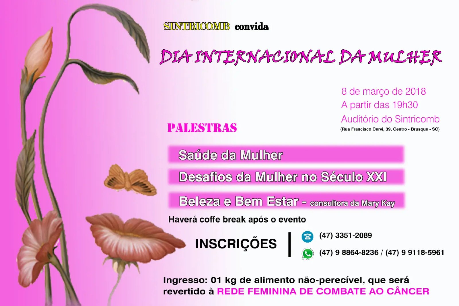 O Dia Internacional da Mulher está chegando. A data, comemorada em 8 de março, é o símbolo da luta feminina por sua consolidação na sociedade e, ao mesmo tempo, das conquistas obtidas através dos séculos. O Sindicato dos Trabalhadores nas Indústrias da Construção e do Mobiliário de Brusque e região (Sintricomb) realizará um evento alusivo à data na próxima quinta-feira. O ingresso será um quilo de alimento não-perecível em prol da Rede Feminina de Combate ao Câncer de Brusque.