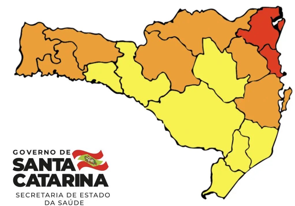 O Alto Vale do Rio do Peixe, Extremo Oeste, Grande Florianópolis, Médio Vale do Itajaí, Oeste, Planalto Norte e Xanxerê foram classificadas com o risco Grave, recebendo a cor laranja. Já as outras sete regiões estão classificadas com o Risco Alto, indicado em amarelo no mapa: Alto Uruguai Catarinense, Alto Vale do Itajaí, Carbonífera, Extremo Sul, Laguna, Meio Oeste e Serra Catarinense.