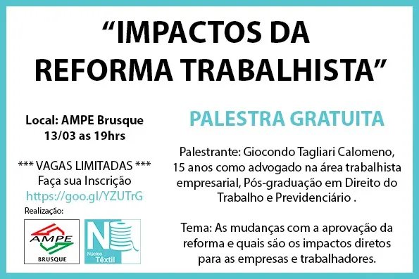 No dia 13 de março, a Associação das Micro e Pequenas Empresas de Brusque e Região (AmpeBr), através de seu Núcleo Têxtil, promove a palestra ‘Impactos da Reforma Trabalhista’. O evento acontece às 19h na sede da entidade, e tem como objetivo expor as mudanças com a aprovação da reforma e quais os impactos diretos para as empresas e trabalhadores.