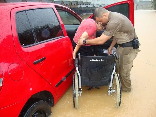 Uma mulher de 58 anos e sua neta, de apenas sete, viveram momentos de aflição quando a chuva caiu forte nesta tarde na cidade de Brusque. Elas ficaram presas dentro do carro em um estacionamento no centro. A mulher é cadeirante.