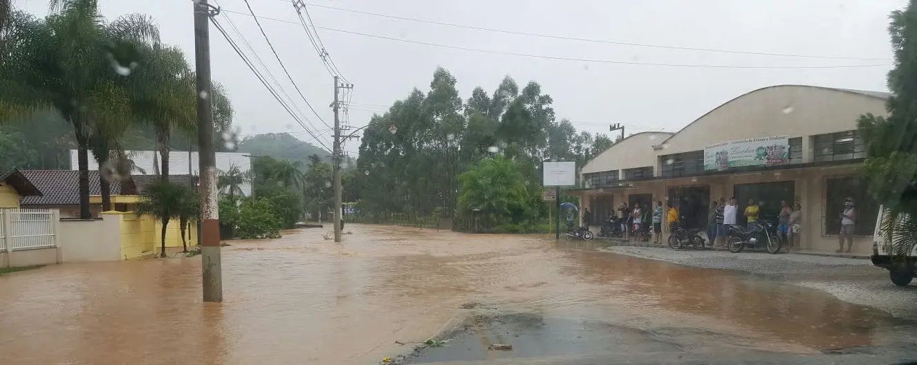Na Rua São Pedro, o volume de água também prejudicou o tráfego de veículos em alguns trechos. Mesma situação na área central da cidade. Volume grande de água também impediu o trânsito na Avenida Cônsul Carlos Renaux.