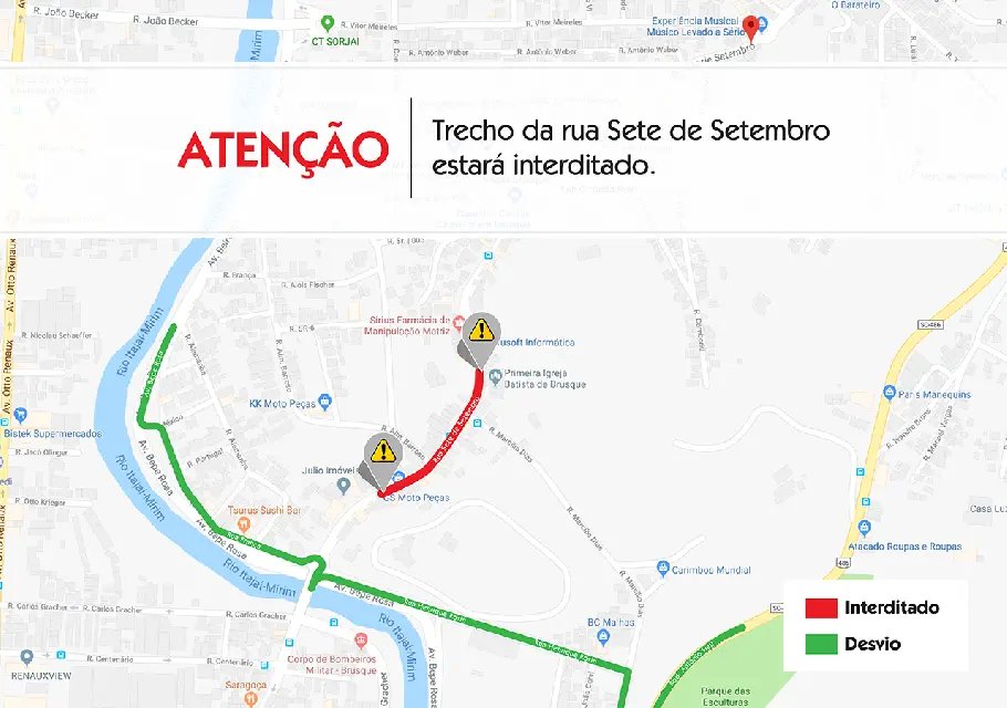 Durante os trabalhos, que devem se estender até segunda-feira (5), às 13h30, os motoristas devem estar atentos às rotas de desvio. Os cidadãos que precisarem se deslocar em direção ao bairro Santa Terezinha, Itajaí e ao Centro deverão utilizar a rodovia Antônio Heil e a avenida Beira Rio.