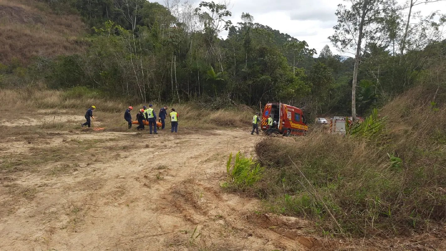 O helicóptero Arcanjo, do Corpo de Bombeiros, precisou ser acionado para retirar a vítima do local, situado em uma área mais alta.