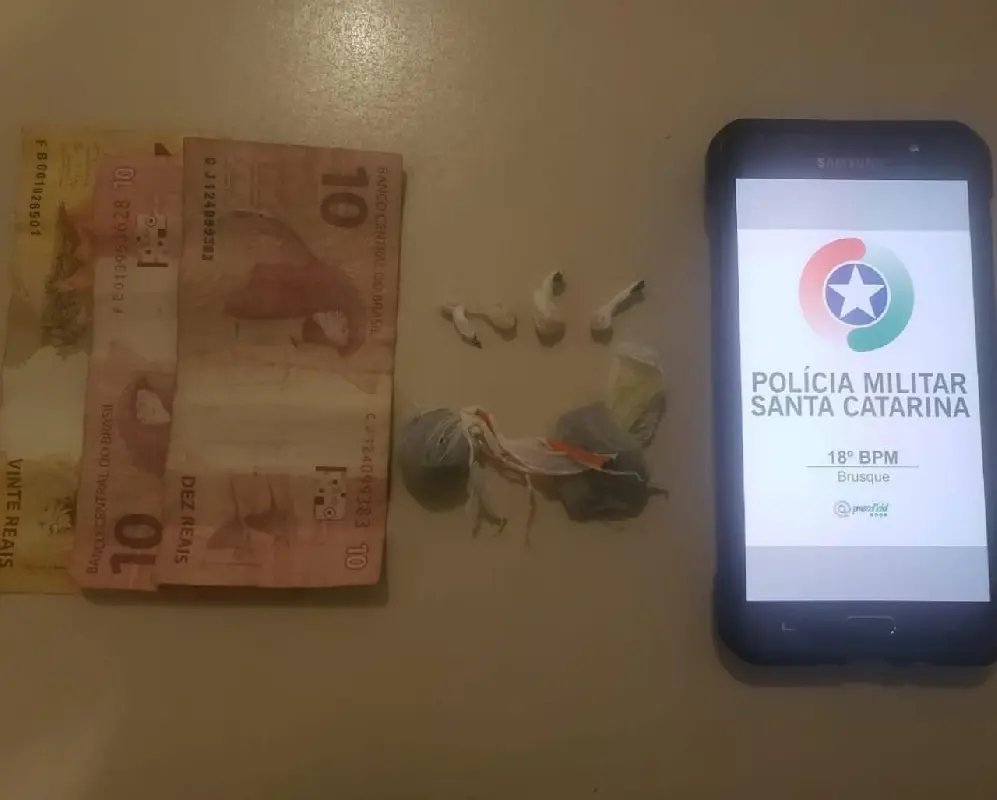 A Guarnição de Rondas Ostensivas com o Apoio de Motocicletas (Rocam) de Brusque em rondas pela rodovia Antônio Heil na quinta-feira (13) avistou um homem em atitude suspeita, e ele ao perceber a presença da guarnição imediatamente dispensou uma embalagem plástica de cor branca em uma rua lateral e começou a caminhar rapidamente no sentido centro. Durante a abordagem pessoal foi encontrado em seu bolso, dois torrões pequenos de substancia semelhante a maconha e juntamente R$ 40,00 em espécie.