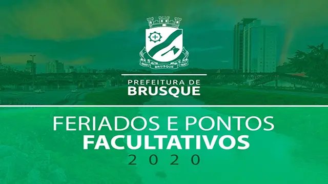 A Prefeitura de Brusque, por meio do Decreto 8.532 de 2020, divulgou essa semana a data dos feriados oficiais e pontos facultativos do ano de 2020. No total, serão 14 datas, sendo que, destas, 11 são consideradas feriados nacionais ou municipais.