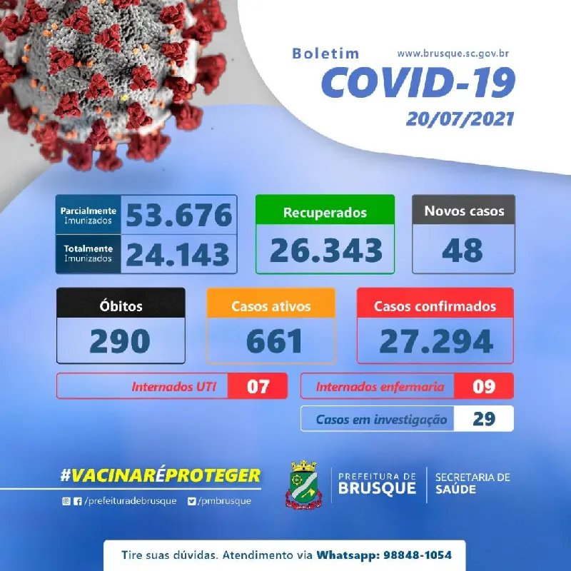 São 27.294 os casos confirmados de Covid-19 em Brusque desde o início da pandemia do novo coronavírus. É o que demonstra o boletim epidemiológico divulgado na tarde desta terça-feira (20), pela Diretoria de Vigilância em Saúde. Nas últimas 24 horas, foram notificadas 48 novas ocorrências da doença no município. Do total de infectados, 26.343 pacientes estão recuperados. Há 661 casos ativos e 29 em investigação.