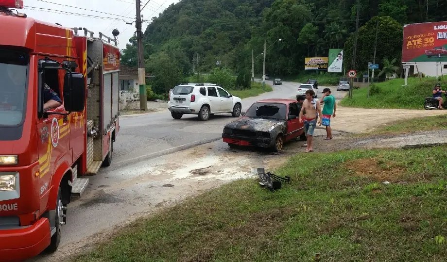 Uma viatura do Corpo de Bombeiros Militar se deslocou para controlar as chamas do GM Chevette, de cor vermelha. A Polícia Militar também foi acionada para realizar o boletim.