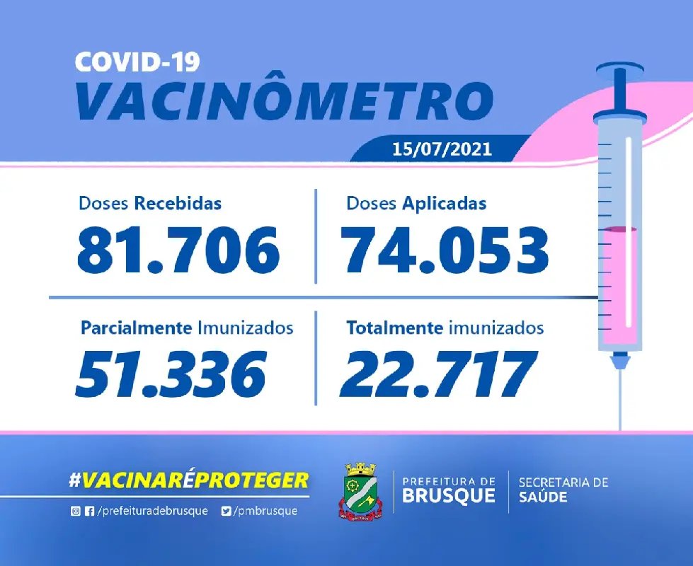 Brusque totaliza 74.053 doses da vacina contra a Covid-19 já ministradas aos moradores. É o que demonstram os dados do Boletim de Vacinação apresentado na manhã desta quinta-feira (15), pela Diretoria de Vigilância em Saúde da cidade.