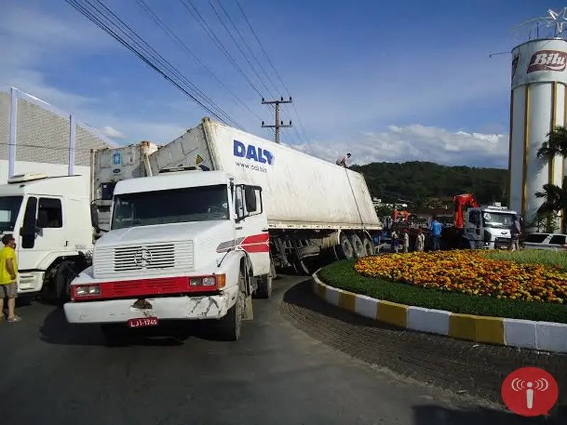 Uma manobra mal sucedida deixou o trânsito, nas proximidades da empresa Bilu, no Bairro Santa Terezinha, muito lento na tarde desta terça-feira (3). Uma carreta Mercedes Benz, com placas de Itajaí, que carregava um container com 30 mil quilos de produtos químicos, quase tombou e ficou inclinada no trevo.