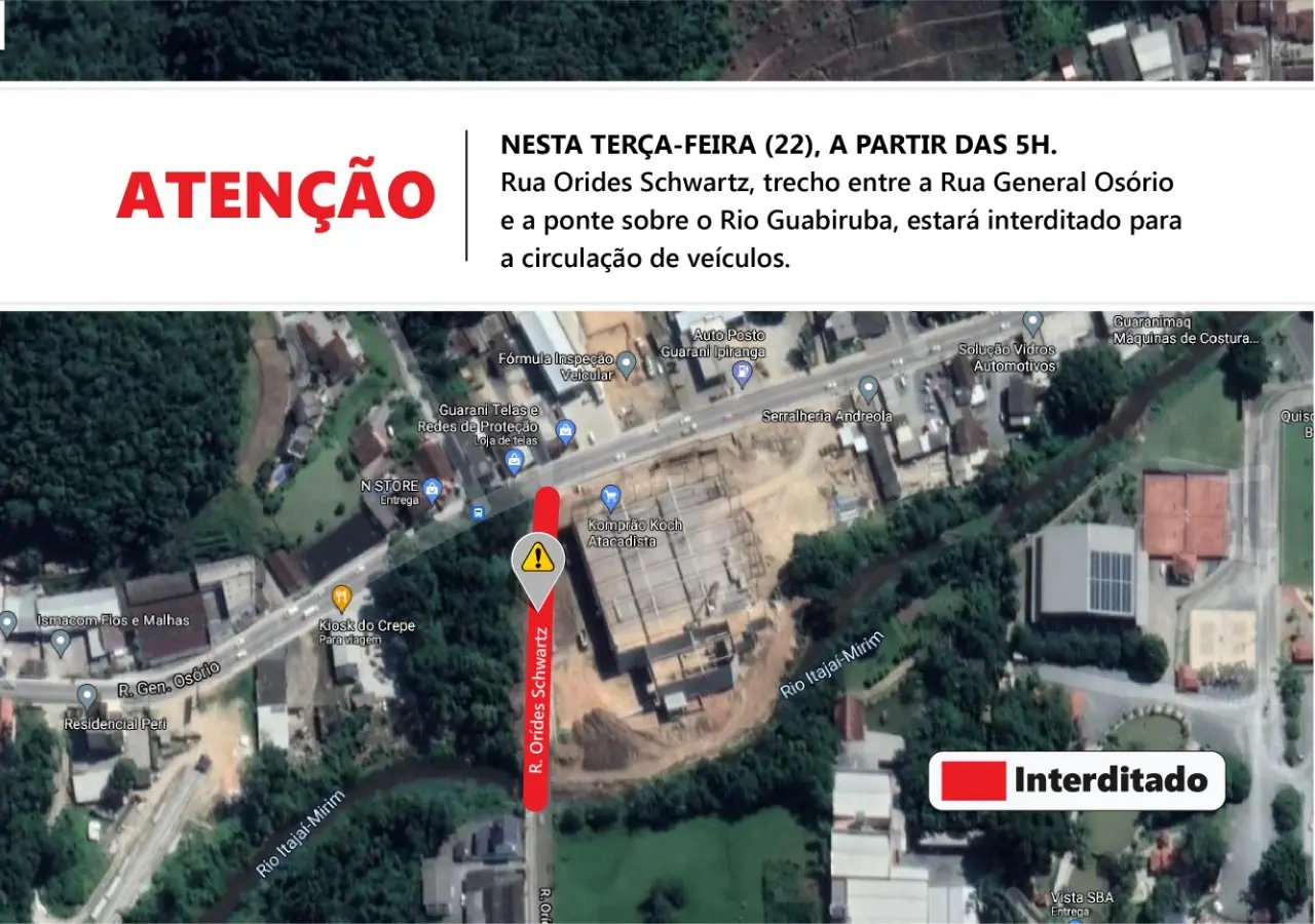 A Prefeitura de Brusque, por meio da Diretoria de Trânsito, comunica que a rua Orides Schwartz, trecho entre a rua General Osório e a ponte sobre o Rio Guabiruba será interditada para a circulação de veículos nesta terça-feira (22), a partir das 5h.