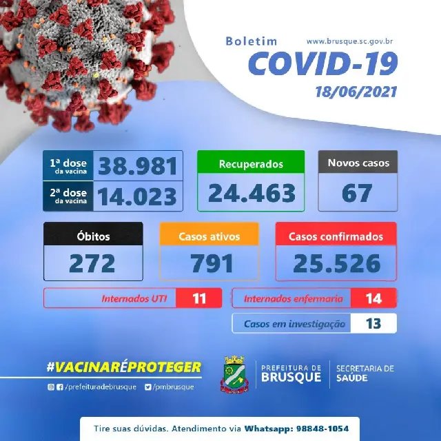 Brusque tem 25.526 casos confirmados de Covid-19 desde o início da pandemia do novo coronavírus. O boletim epidemiológico divulgado no fim da tarde desta sexta-feira (18), pela Diretoria de Vigilância em Saúde registra que, nas últimas 24 horas, foram notificadas 67 novas ocorrências da doença no município. Deste total, 24.463 pessoas estão recuperadas. Há 791 casos ativos e 13 em investigação.