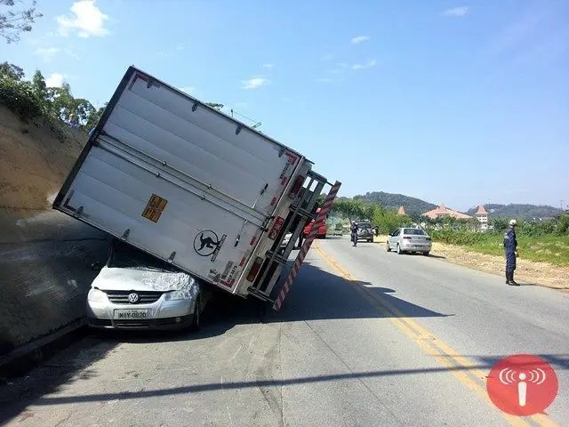 Era por volta de 9h30min, quando o condutor da Mercedes Benz, de 22 anos de idade, não conseguiu vencer a curva e o acidente acabou ocorrendo. Ele não se feriu. Silvio Fischer (57), condutor do carro, apesar de se ferir superficialmente, pode comemorar mais uma data de aniversário, pois o paredão de concreto segurou o caminhão, evitando que ele caísse totalmente sobre o automóvel.