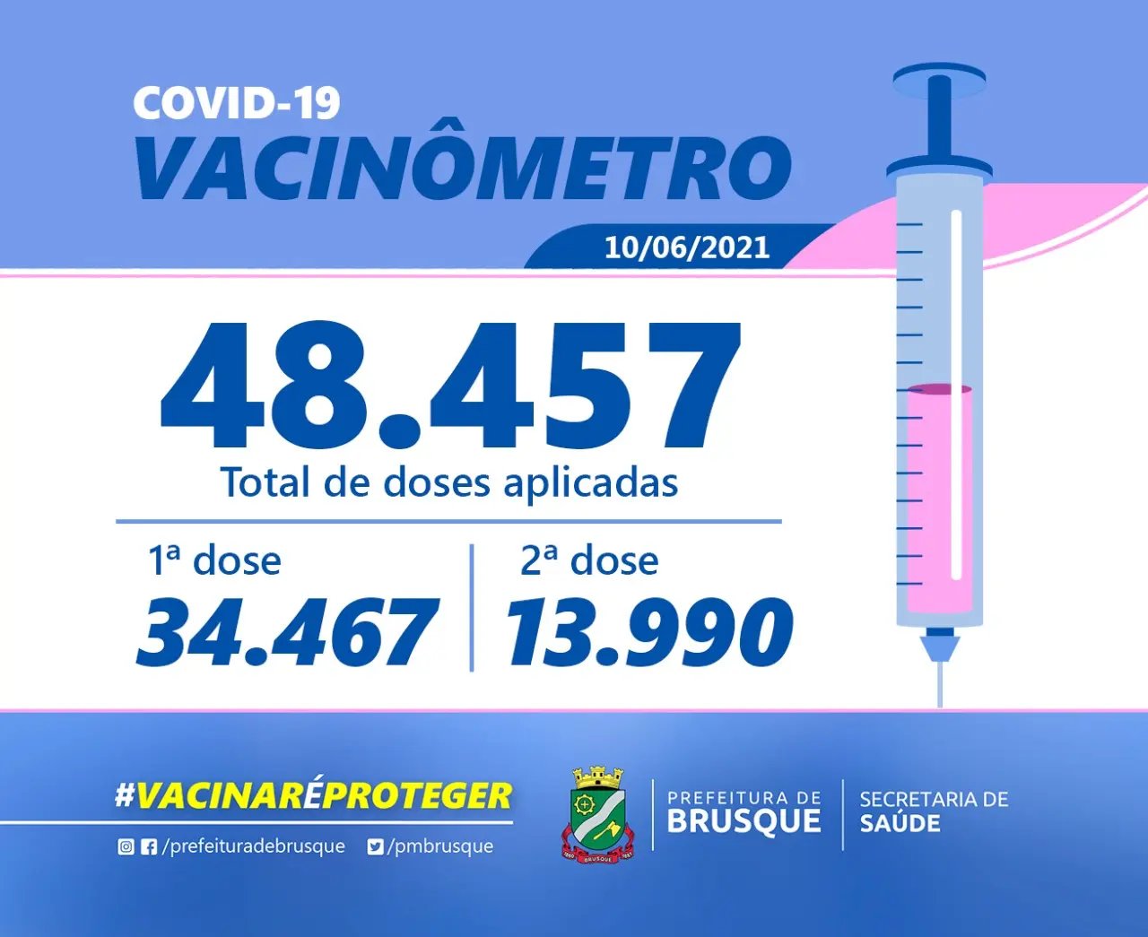 Brusque totaliza, na manhã desta quinta-feira (10), 48.457 doses da vacina contra a Covid-19 já aplicadas a seus moradores. É o que aponta o novo Boletim de Vacinação divulgado pela Diretoria de Vigilância em Saúde da cidade. O levantamento aponta que a primeira dose do imunizante já foi aplicada a 34.467 pessoas. E a segunda dose, ministrada a 13.990 pessoas.