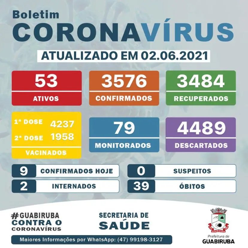 Até agora, Guabiruba possui 39 óbitos pelo vírus, 4237 cidadãos já vacinados com a primeira dose contra a Covid-19, destes, 1958 já foram vacinados também com a segunda dose.