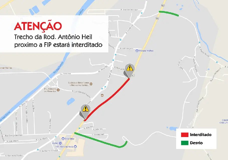 Devido às obras de drenagem no bairro Nova Brasília, neste domingo (29) a rodovia Antônio Heil estará interditada, nas proximidades da FIP. As equipes da Secretaria de Obras farão a travessia da tubulação pela rodovia a partir de sábado (28). O andamento dos trabalhos depende das condições climáticas.