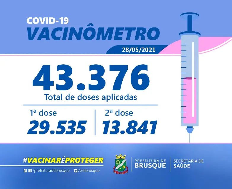 Brusque totaliza, na manhã desta sexta-feira (28), 43.376 doses da vacina contra a COVID-19 já aplicadas a seus moradores. É o que aponta o novo Boletim de Vacinação divulgado pela Diretoria de Vigilância em Saúde da cidade. O levantamento aponta que a primeira dose do imunizante já foi aplicada a 29.535 pessoas. E a segunda dose, ministrada a 13.841 pessoas.