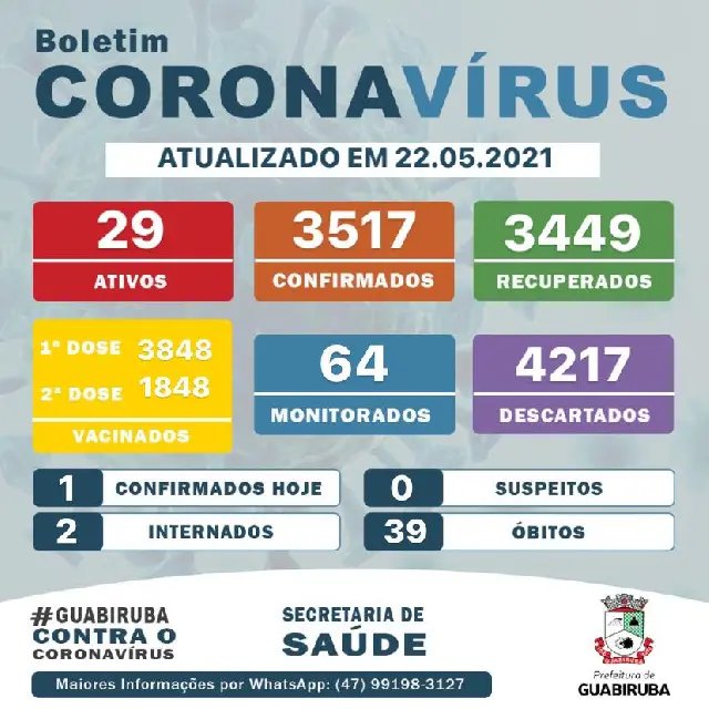 O Centro de Triagem não detectou novos suspeitos. No total Guabiruba possui dois cidadãos internados em Brusque: um na enfermaria e um na UTI. Até agora, Guabiruba possui 39 óbitos pelo vírus, 3848 cidadãos já vacinados com a primeira dose contra a Covid-19, destes, 1848 já foram vacinados também com a segunda dose.
