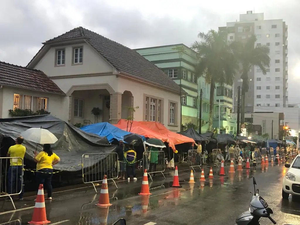 Mesmo com a chuva que marcou presença neste sábado (26), manifestantes de forma pacífica, permanecem em frente ao Tiro de Guerra, na rua Felipe Schmidt, bairro São Luiz, em Brusque.