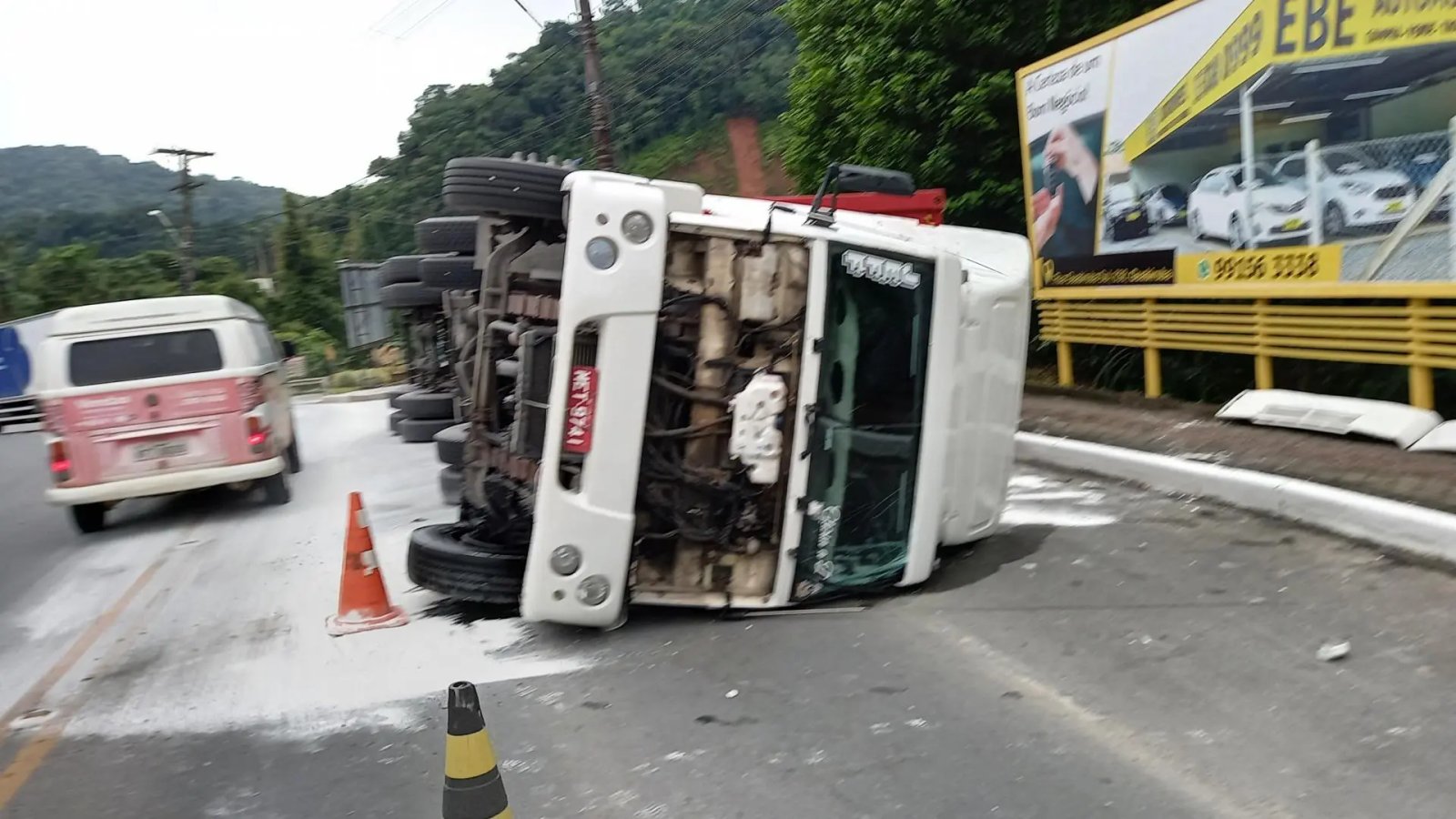 O motorista estava no local quando a reportagem chegou e disse que não conseguiu vencer uma das curvas ali próximo, o que fez com que acabasse tombando.
