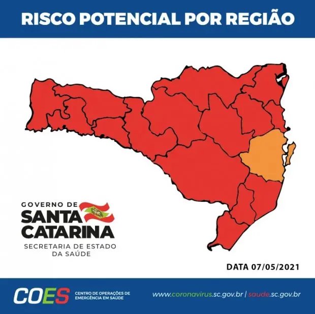 Pela segunda semana consecutiva, a Matriz de Risco Potencial divulgada neste sábado (08), aponta que apenas a região da Grande Florianópolis se manteve no patamar grave para a transmissão da Covid-19. Todas as outras 15 regiões foram classificadas em nível gravíssimo. Não houve alterações de classificação em relação à matriz divulgada no último final de semana.