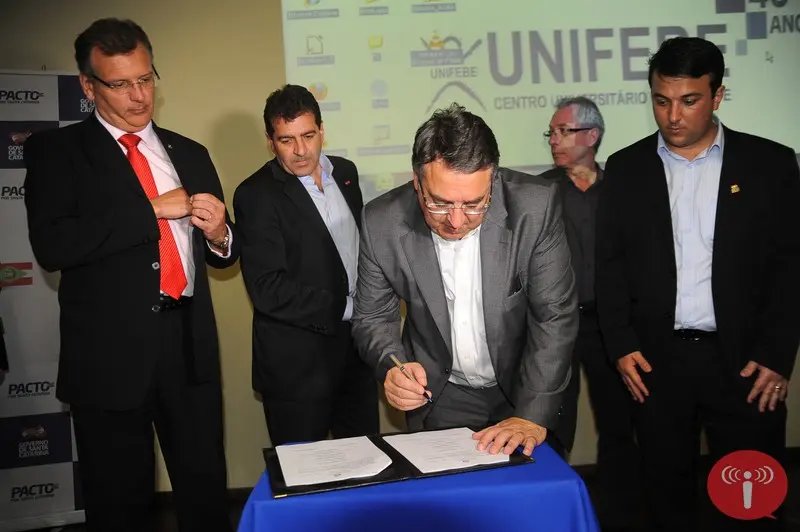 O auditório do Centro Universitário de Brusque (Unifebe) foi palco do terceiro e último compromisso do governador de Santa Catarina, Raimundo Colombo, durante a manhã e início de tarde desta quinta-feira (22) na cidade. Lá, foram assinados os convênios com a Escola de Música do Centro Empresarial, Social e Cultural de Brusque (Cescb), na ordem de R$ 120 mil e, também, a tão esperada duplicação da SC 486, em seu trecho Brusque-Itajaí, em parceria com a empresa Irmãos Fischer.