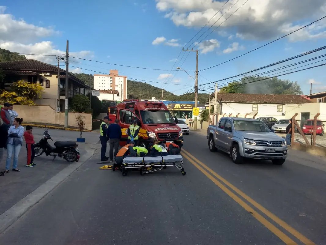 No local, foi constatado uma colisão envolvendo um Honda Civic , de cor branca, placas de Guabiruba, conduzido por um homem de 63 anos, que não se feriu, e uma motocicleta Honda Biz, de cor preta, placa de Guabiruba, conduzida por uma mulher de 52 anos, que encontrava-se caída na via, consciente e orientada, apresentando ferimento abrasivo no membro superior esquerdo, membro inferior esquerdo e membro inferior direito.