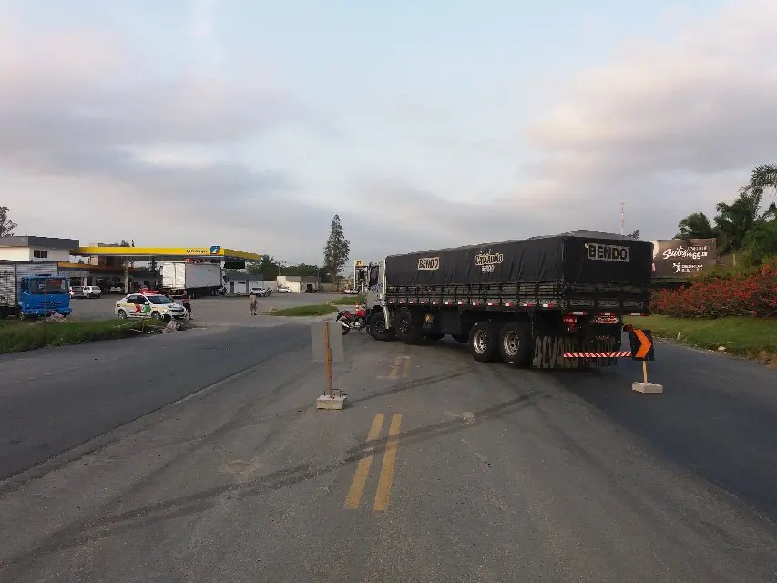 A colisão entre um caminhão e uma motocicleta interrompeu o trânsito na Rodovia Antonio Heil, Bairro Limoeiro, na tarde desta quarta-feira (13). A colisão aconteceu no entroncamento da rodovia com a Rua José Hamilton Merizio Junior.