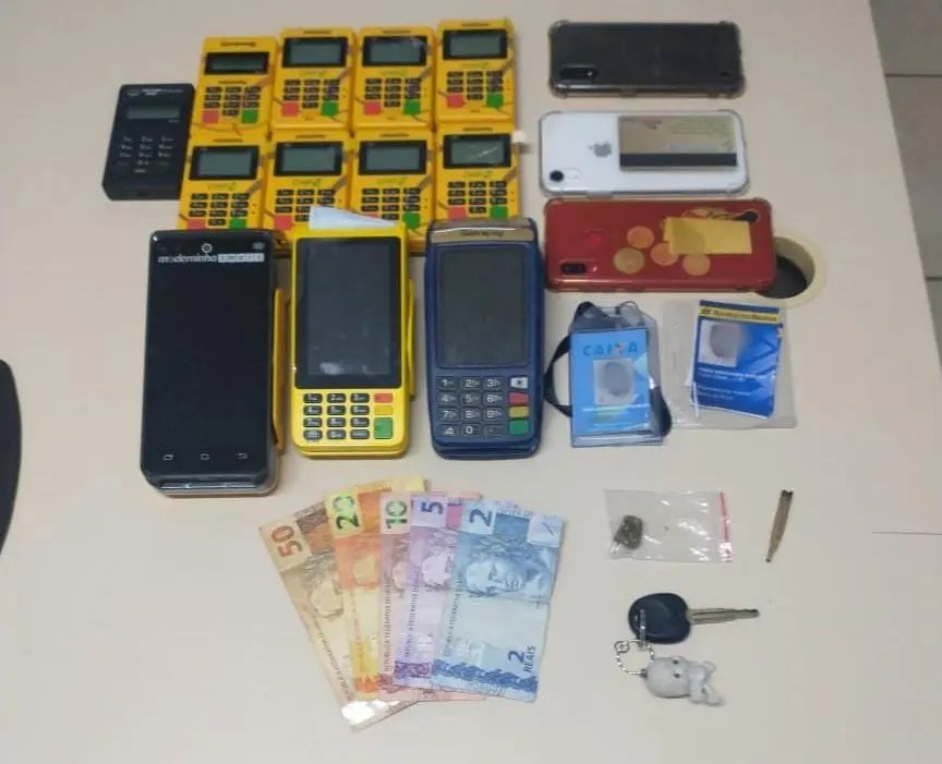 Após diligências, os envolvidos, três homens, naturais de São Paulo foram localizados e abordados. Eles estavam hospedados em um hotel na área central. Em entrevista, os autores relataram que vieram à região para aplicar o "golpe do cartão". Ainda de posse dos abordados, foram encontradas 12 maquininhas de cartão, uma porção de maconha, R$ 87 reais e três celulares.