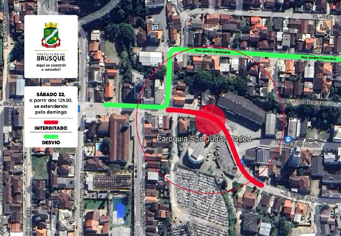 A Prefeitura de Brusque, por meio da Diretoria de Trânsito, comunica aos condutores, que neste final de semana, a rua Santa Cruz, no bairro Águas Claras, nas proximidades da Paróquia São Judas Tadeu estará interditada.