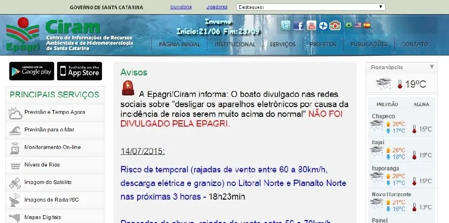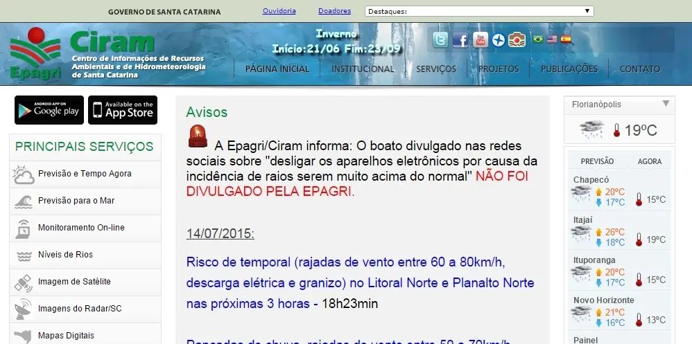 Um alerta que teria sido emitido pela Epagri/Ciram, órgão que monitora o clima em Santa Catarina, foi desmentido pela própria instituição. A mensagem de atenção estaria sendo repassada pelo aplicativo WhatsApp na tarde desta terça-feira (14) não foi divulgada pela Epagri.