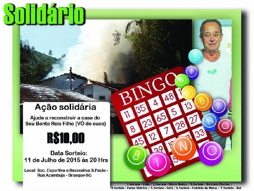 No próximo sábado (11) ocorre o bingo para ajudar na reconstrução da casa de Bento Reis Filho, mais conhecido como “Vô do Suco”. A ação acontece nas dependências da Sociedade Esportiva e Recreativa São Paulo, localizada na Rua Azambuja, Bairro de mesmo nome, a partir das 20h.
