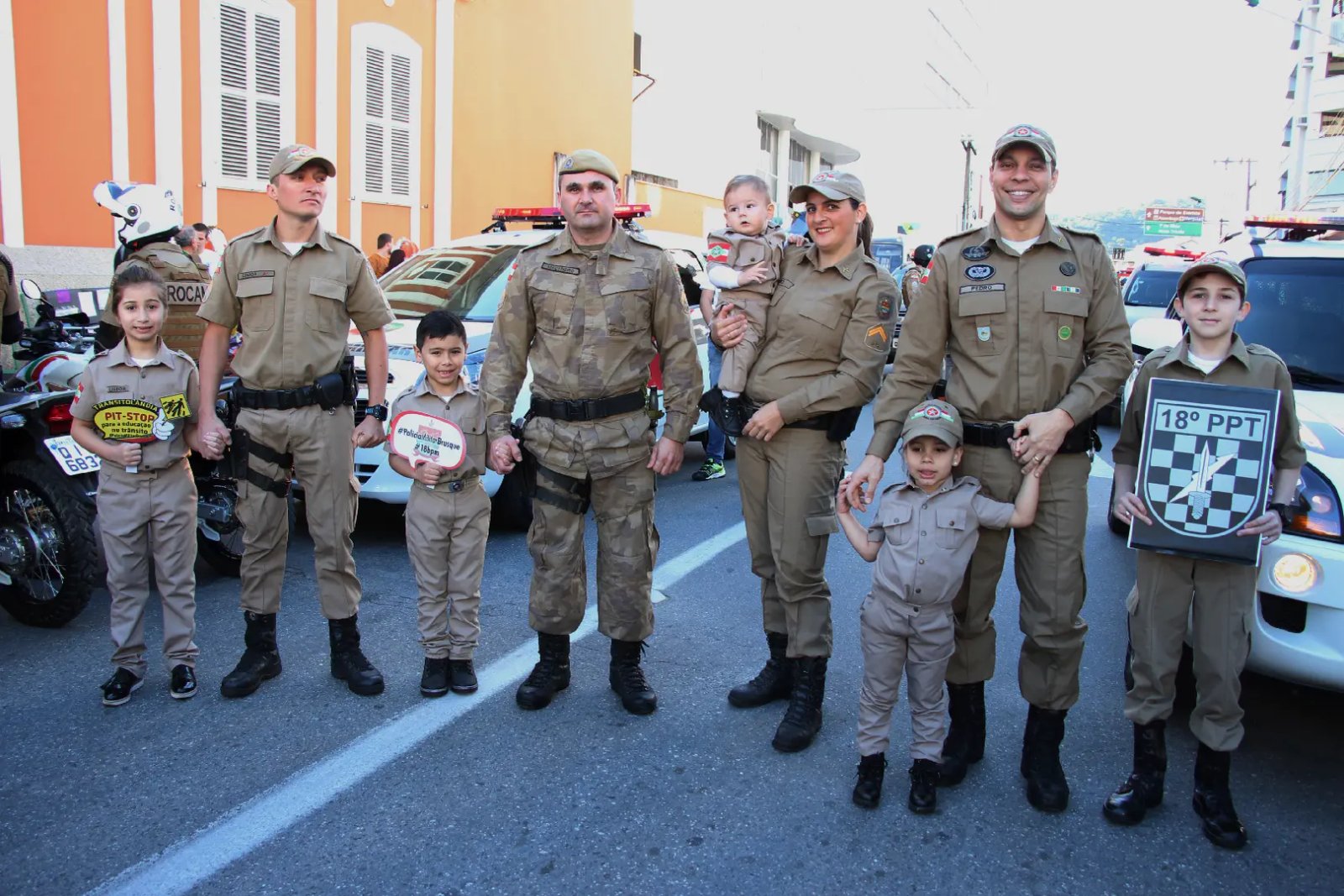 No desfile de 4 de agosto, comemorativo aos 157 anos de Brusque, alguns integrantes do 18º Batalhão da Polícia Militar do município desfilaram acompanhados por seus filhos, que estavam devidamente trajados com fardas mirins confeccionadas pelo curso de Design de Moda da UNIFEBE. A iniciativa para a produção dos uniformes infantis partiu da Soldado Katiuce Eliati Bolfe, auxiliar do P-5 do 18º BPM, que buscou com o laboratório de Moda (LAB.Moda) uma parceria para realizar a vontade dos pais em desfilar com seus filhos fardados.