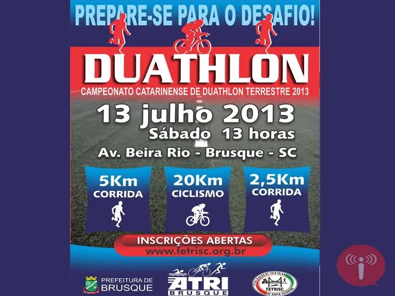 A exemplo do que aconteceu em 2012, Brusque realizará a etapa de abertura do Campeonato Catarinense de Duatlo. A competição acontecerá no dia 13 de julho e contemplará três baterias com 5 km de corrida, outros 20 km de ciclismo e mais 5 km de corrida.