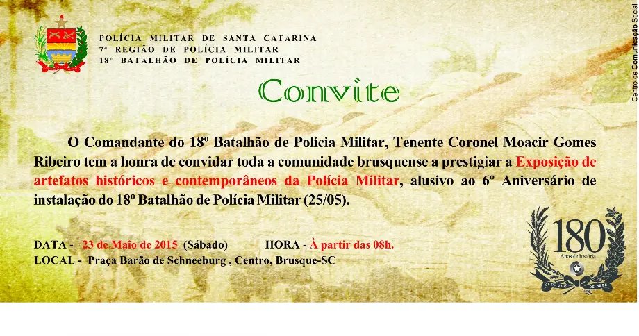 O convite é para toda comunidade e é realizado pelo comandante do batalhão brusquense, tenente-coronel Moacir Gomes Ribeiro.