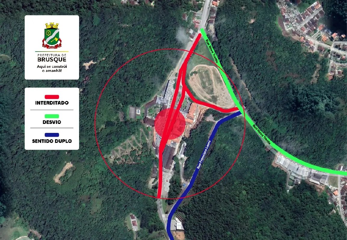 O trecho antigo da rua Nova Trento também estará interditado (lateral dos consultórios). Os ônibus do transporte coletivo e eventuais caminhões poderão utilizar a rua Luiz Vanolli, como alternativa de ligação no sentido Centro/bairro.