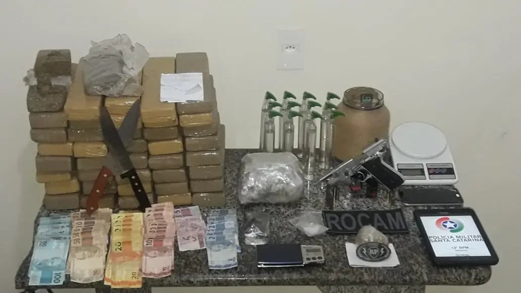 Em buscas na moradia de Tijucas, as guarnições encontraram 33 kg de maconha em 40 tabletes, 462g de skank, 200g de haxixe, 87g de MD, 04g de cocaína, 11 frascos de lança-perfume, uma balança de precisão e um caderno com anotações do tráfico, com movimentações no valor aproximado de R$ 29 mil.