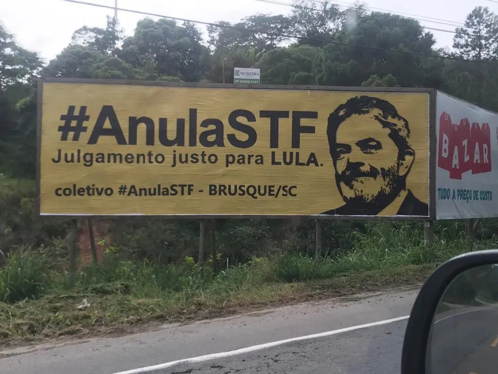 Um outdoor localizado na Rodovia Ivo Silveira, próximo à entrada da RVB Malhas, pede a anulação dos processos contra o ex-presidente Lula e solicita que o petista tenha um “julgamento justo”.