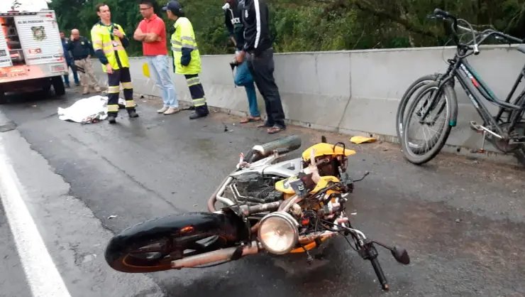 Um homem morreu após colidir com sua motocicleta Honda CBX/250 com placas de Balneário Camboriú na traseira uma bicicleta e ser atingido por um caminhão. O acidente ocorreu por volta das 6h da manhã desta quarta-feira (26), no Km 127,2 da BR-101, em Itajaí.