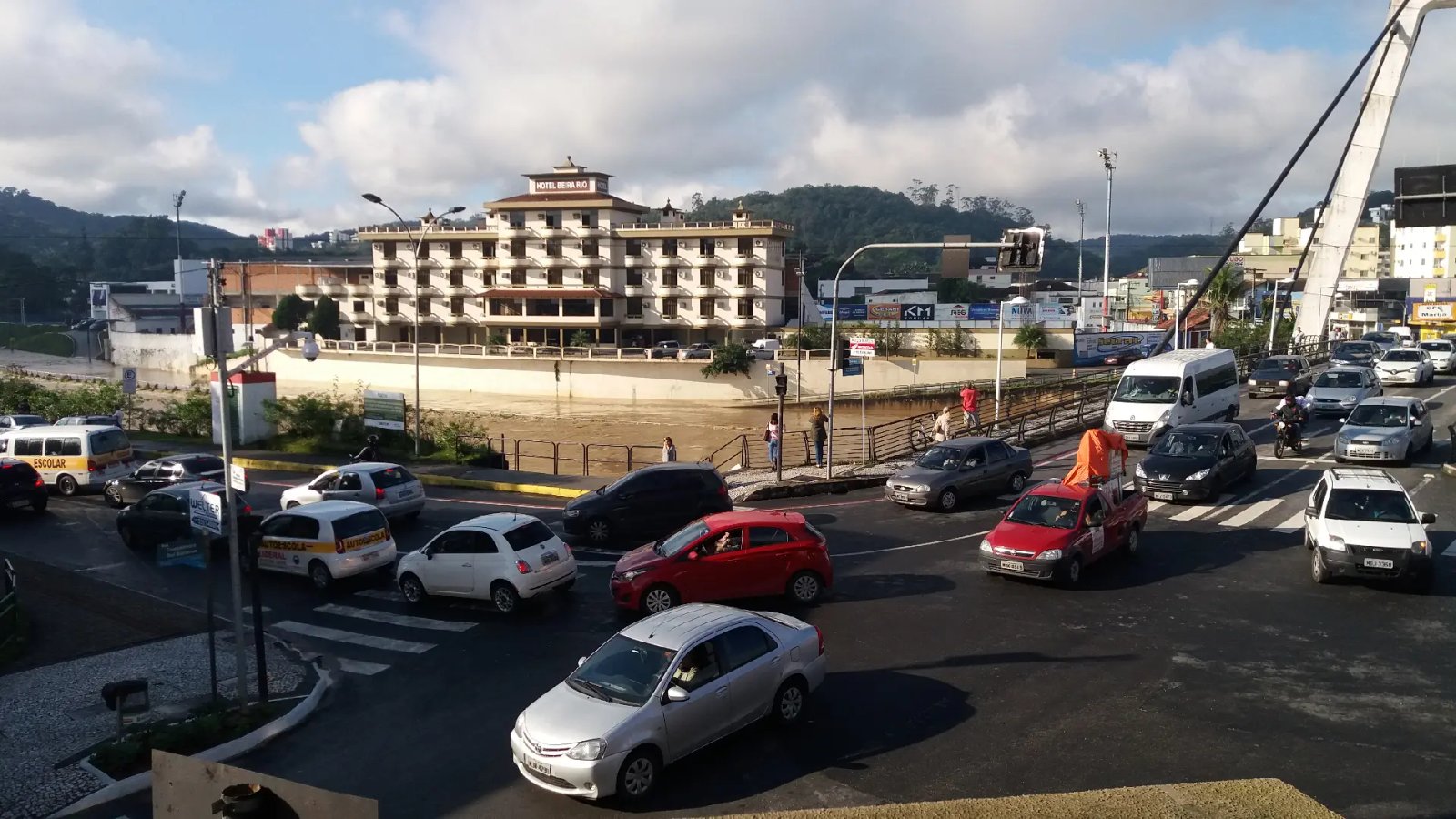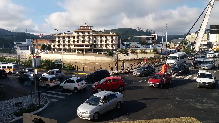 A fila no semáforo da ponte Irineu Bornhausen apresenta congestionamento intenso de veículo. Várias placas de orientação foram colocadas em ruas interditadas pela Guarda de Trânsito de Brusque (GTB), com objetivo de orientar os motoristas.