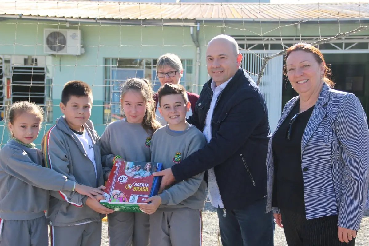 A Prefeitura de Brusque, por meio da Secretaria da Educação, realizou nesta quarta-feira (5) a entrega simbólica dos kits do Programa Acerta Brasil. O ato ocorreu na escola do Cedro Alto e contou com a presença do vice-prefeito, Ari Vequi, além da secretária da Educação Eliani Busnardo Buemo. A diretora de Ensino Fundamental, Maria Ivone Crespi Noldin, além da assessora de projetos, Deise Freitas de Oliveira Pereira, também prestigiaram o evento.